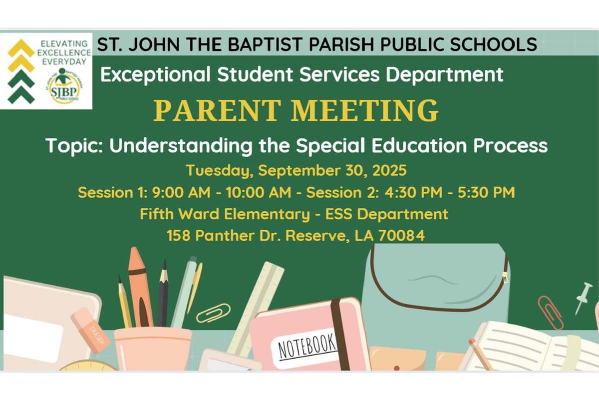 The St. John the Baptist Parish Schools’ Exceptional Student Services (ESS) Department invites parents and guardians to attend an informational meeting designed to support families in understanding the Special Education process.