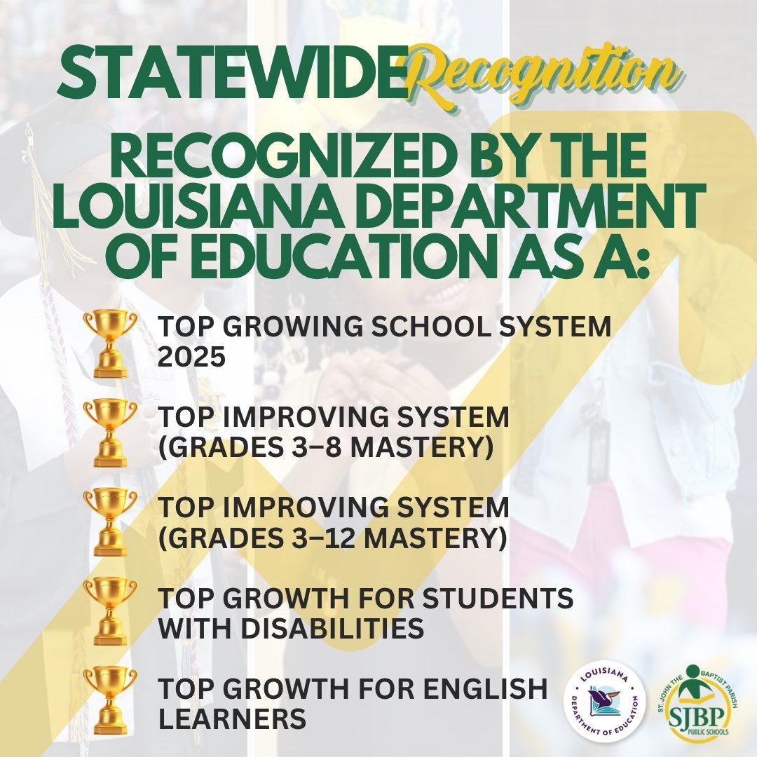 We’re proud to announce that our district has been recognized by the Louisiana Department of Education for exceptional academic growth.